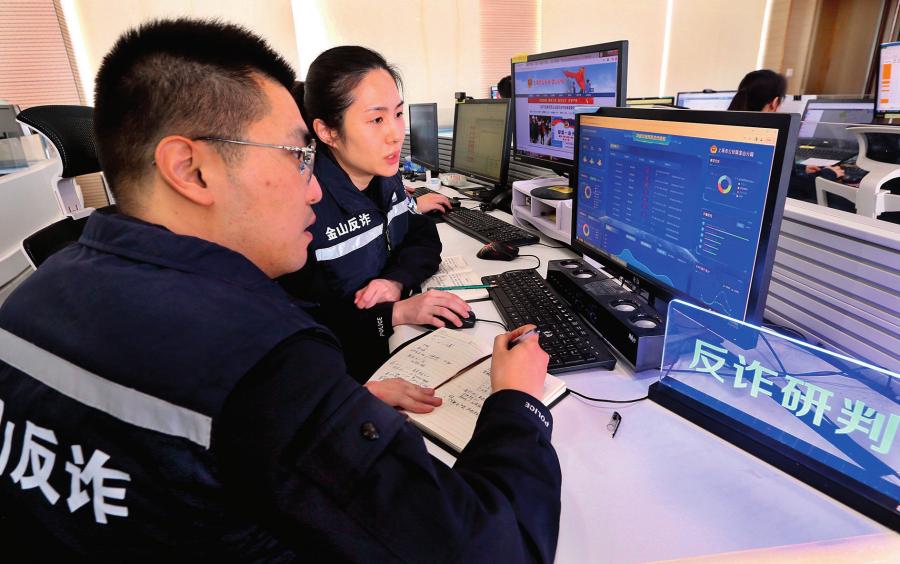 上海市公安局金山分局反诈中心民警在反诈 App “金护”后台查看预警数据并研判案情(2025 年 3 月 25 日摄) 凡军摄 / 本刊